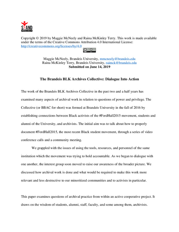 Maggie McNeely and Raina McKinley Terry gave a presentation on this paper, "The Brandeis Archives Collective: Dialogue in Action," at the University of Rhode Island STAND Symposium on 6/14/2019